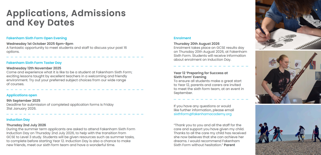 Enrolment takes place on GCSE results Day on Thursday 20th August 2026, at Fakenham Sixth Form. Students will receive information about enrolment on Induction Day.