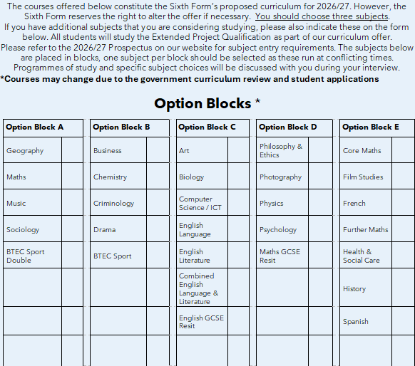 Please see below individual subject pages for all the courses we offer in Sixth Form